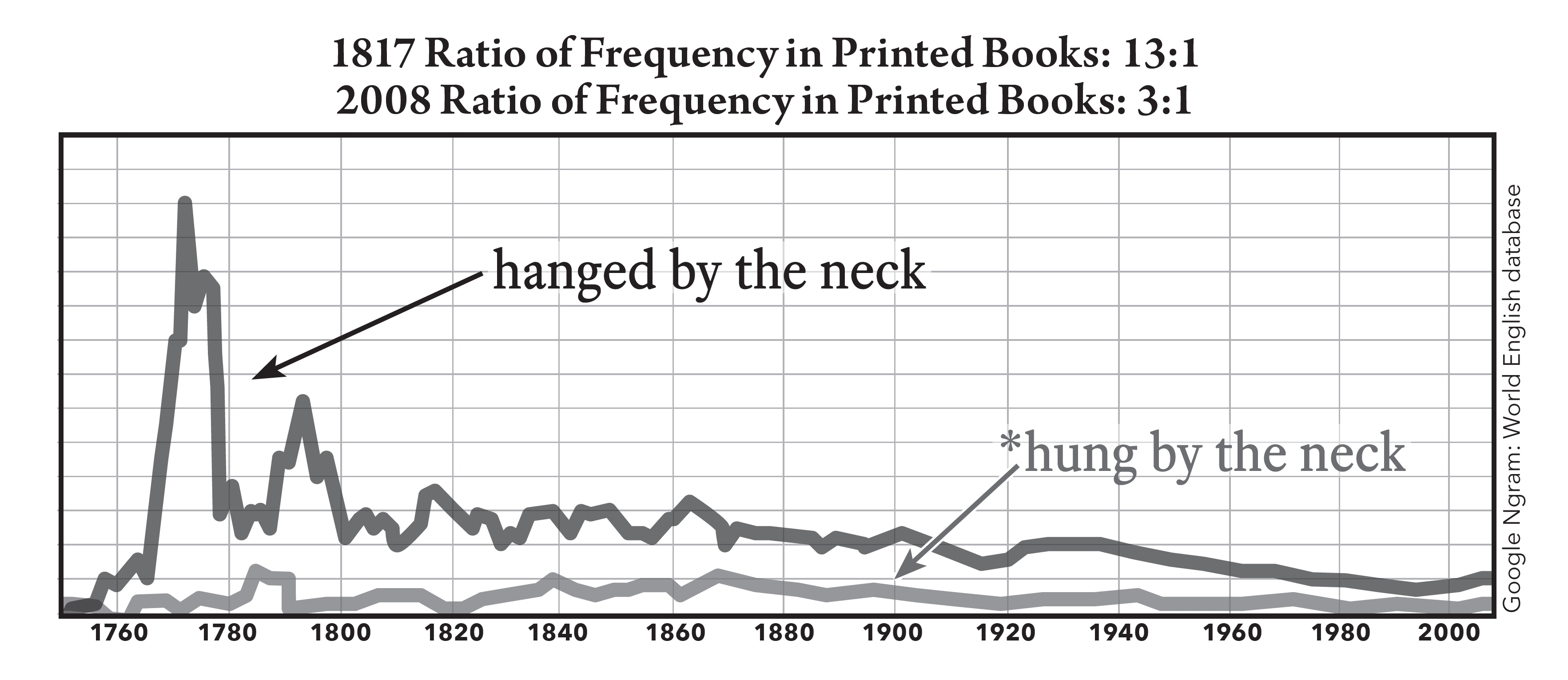BG: Yes. Take “hanged by the neck.” In the eighteenth century, prisoners subject to the death penalty were said to be hanged (not hung) by the neck. That’s been the predominant literary usage forever. But the competitive gap between the terms in this context has narrowed. In 1817, the ratio of hanged versus hung by the neck was 13:1; in the most recent statistic available (2008), it’s 3:1. In other words, many more people now use hung in reference to the gallows.