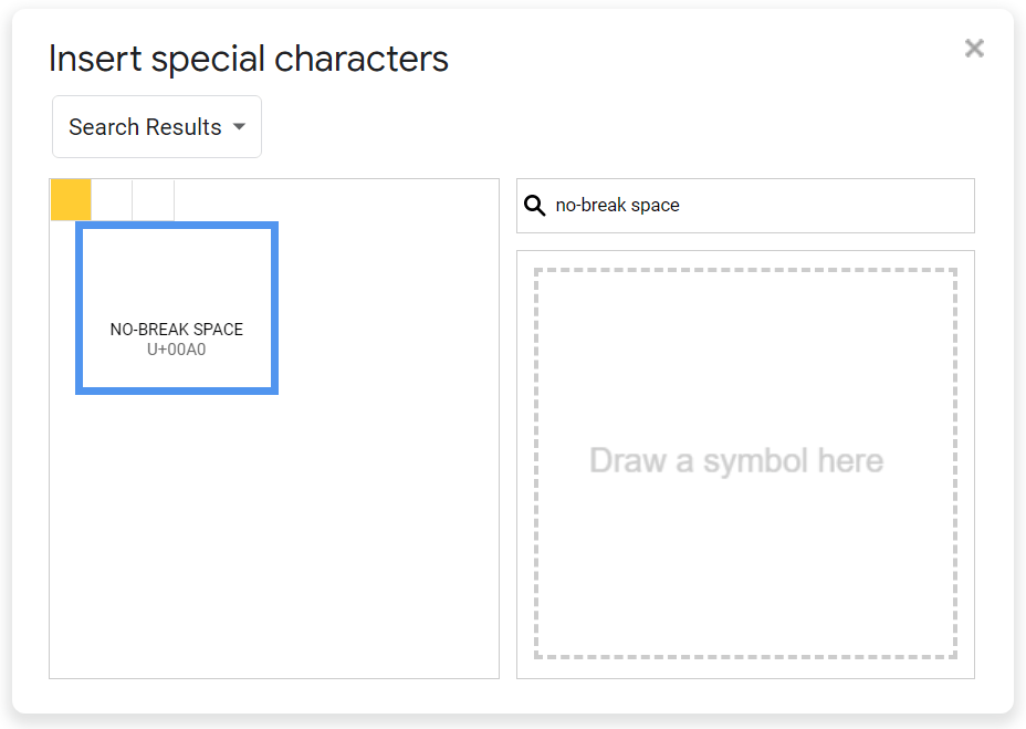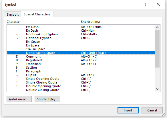 Or in either Word or Docs, you can use the menu for special characters. In Word, go to Insert > Symbol and select “Nonbreaking Space” from the Special Characters tab: